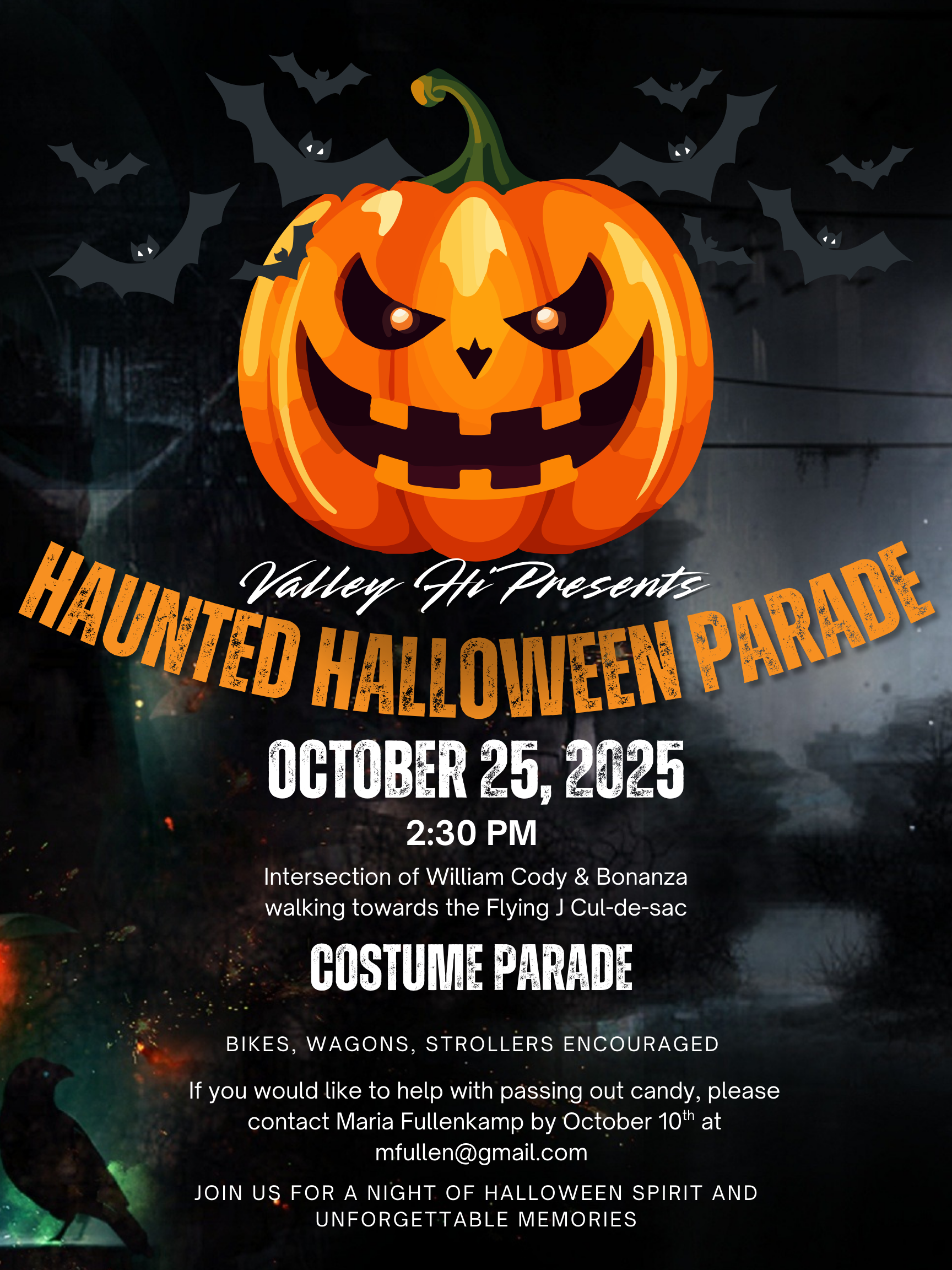 Our next social event will be the Valley-Hi Haunted Halloween Parade which will take place on Saturday, October 25 beginning at 2:30pm at the intersection of Bonanza & William Cody then walking to the cul-de-sac. For all of the fun details, watch your email or download a flyer: here